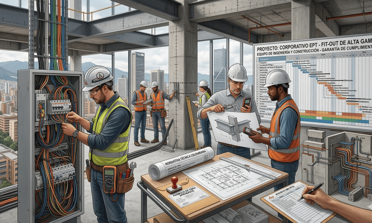 Ingenieros civiles, eléctricos y maestros de obra con amplia trayectoria en obra comercial. Garantizan cumplimiento técnico y normativo.